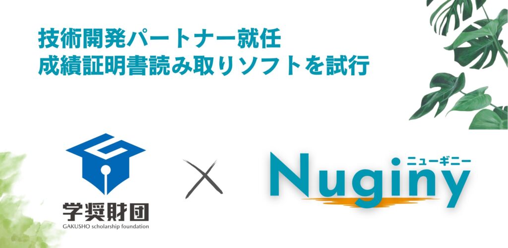 技術開発パートナー就任のお知らせ 平素より株式会社Nuginyをご支援いただき、誠にありがとうございます。このたび、公益財団法人 学奨財団よりご依頼を受け、成績証明書読み取り業務を支援する技術開発パートナーに就任いたしま